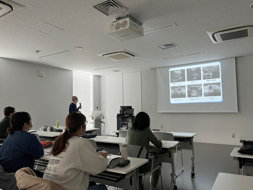 冒頭では、日本シグマックス株式会社 磯尾氏よりプログラム説明が行われ、その後、エコーの原理や画像の見方、評価のポイントについて分かりやすく解説がありました。実習では、小型・ポータブルエコーを実際に操作しながら、画像をタブレットで確認し、現場での活用イメージを具体的に深めることができました。