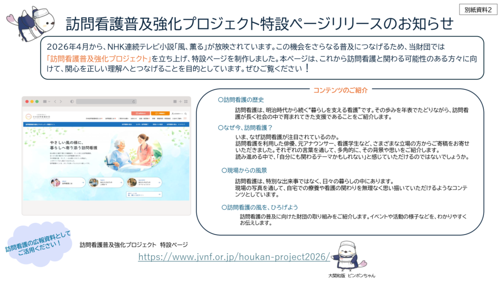 日本訪問看護財団では、訪問看護のさらなる普及を目的として「訪問看護普及強化プロジェクト」を立ち上げ、特設ページを公開しています。